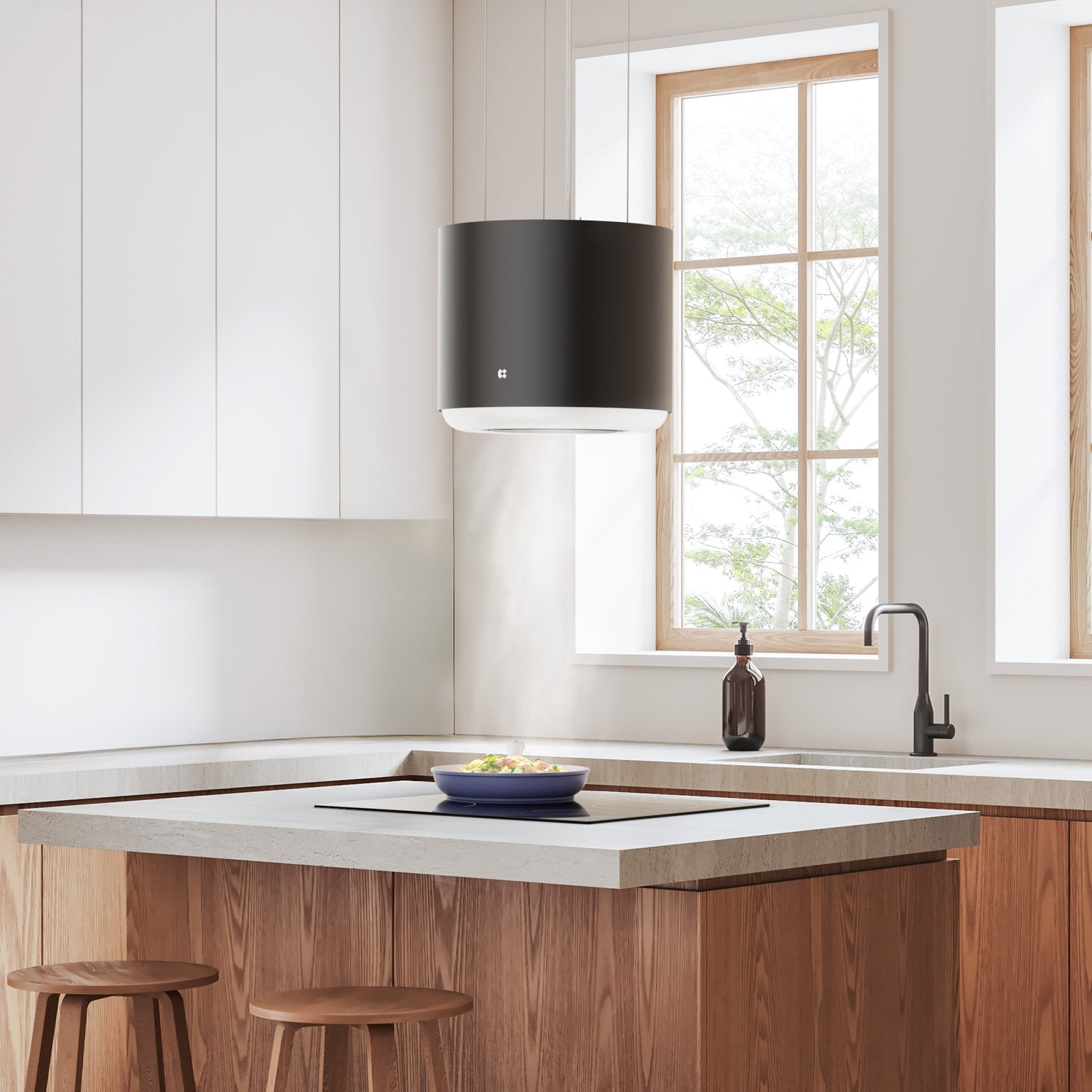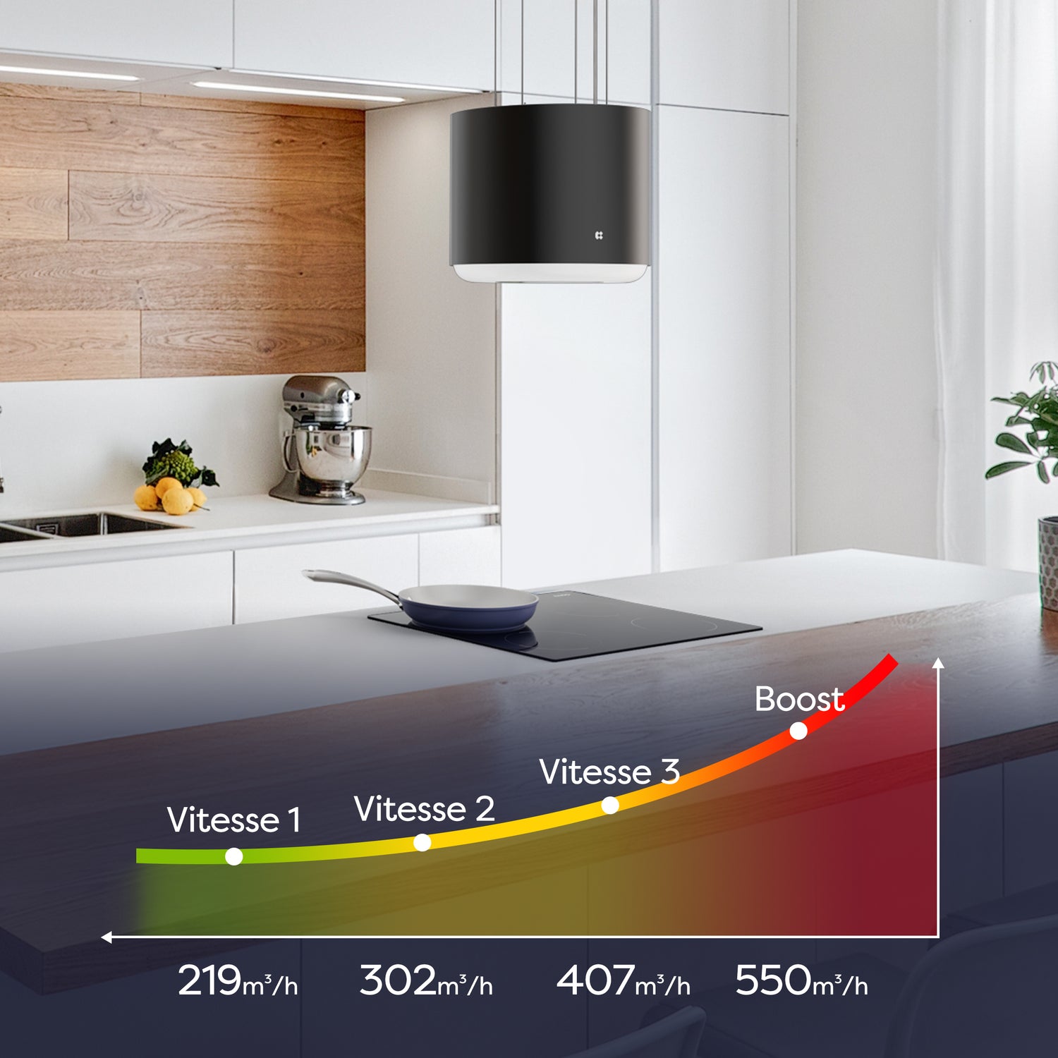 - Hotte îlot 41 cm, débit d'air 550m³/h.