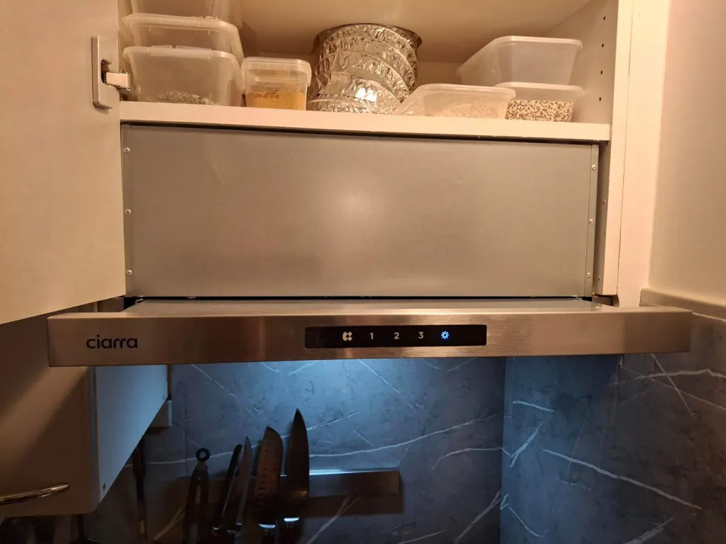 j'ai pris cette hotte pour son gros débit à 580 m3/h et son prix. 1ère impression elle est légère 5kg , en effet les grilles amovibles sont plus légères et la taule de la carcasse est fine, ça ne donne pas une impression de solidité, mais c'est une partie qui ne subit pas de contrainte une fois installée. Mais du coup pour la fixer au meuble j'ai quand même rajouté des rondelles aux vis fournies. Pour l'installer, comme j'étais seul , j'ai démonté le meuble spécial hotte à tiroir et je l'ai mis à l'envers. Pour le réglage de hauteur, j'ai fixé l'étagère à 180mm du bas du meuble, percé le trou d'évacuation de 165mm ( le bord du trou à 120 de la face avant) , pour une évacuation de 150, ça laisse un peu de marge d'ajustement et de la place pour la gaine et le serre clip fourni. J'ai pu ainsi régler parfaitement la position de la hotte de manière à ce que la porte de 16mm du meuble affleure avec la hotte en position repliée. Attention il faudra percer (ou creuser) aussi l'étagère pour le câble d'alimentation qui sort au dessus. . Une fois positionnée on peut la fixer facilement par l'intérieur avec les vis de 20mm fournies. Pour finir j'ai du également acheter un réducteur 150/120 car chez moi le trou d'évacuation est de 120mm! A l'usage je la trouve peu bruyante et efficace en évacuation , les 3 vitesses sont bien proportionnées. la 1 fait très peu de bruit les 2 autres plus mais c'est le prix de l'efficacité et ça reste supportable. ( il y a peu de différence entre la vitesse 2 et 3) - et le fait que quand on replie la hotte tout est "remis à 0" j'aurais aimé une mémorisation des réglages, et quand vous "dépliez le tiroir" , la hotte et la lumière repartent dans l'état où elles étaient. Mais je suis quand même très satisfait du rapport qualité prix, et de la puissance d'aspiration à ce prix là. je recommande