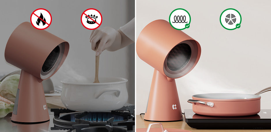 - ⚠️Attention⚠️: HOOD TO GO est recommandé pour une utilisation avec des appareils de cuisson (ex. plaque à induction, grill électrique, cuisinière électrique, etc.) et ne peut pas être utilisé pour la cuisson à flamme nue. L'entrée d'air doit être aussi proche que possible de la surface de cuisson des autres appareils (pas plus de 10 cm) afin d'améliorer l'efficacité du taux d'extraction.