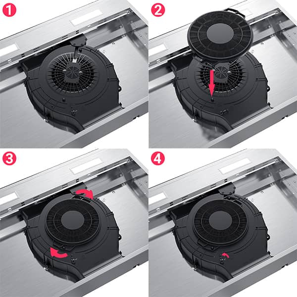 - Insérer le filtre à charbon actif dans le ventilateur selon la figure, le tourner dans le sens antihoraire.