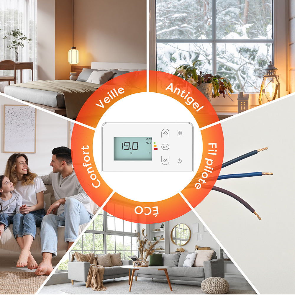 - 🌡️ Thermostat numérique haute précision : Plage de réglage entre 5 °C et 29 °C, avec modes confort, éco et hors-gel.