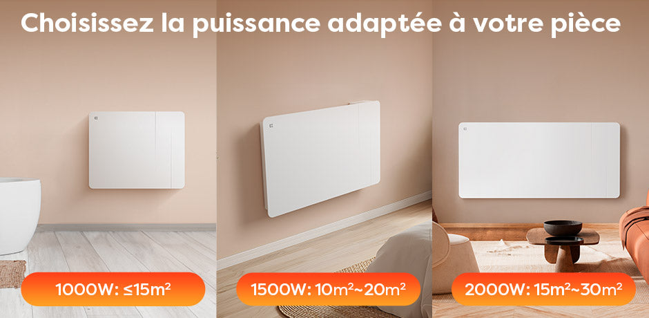| Surface chauffée (m²) | 1000W : <15 m² 1500W : 10~20 m² 2000W : 15~30 m² |