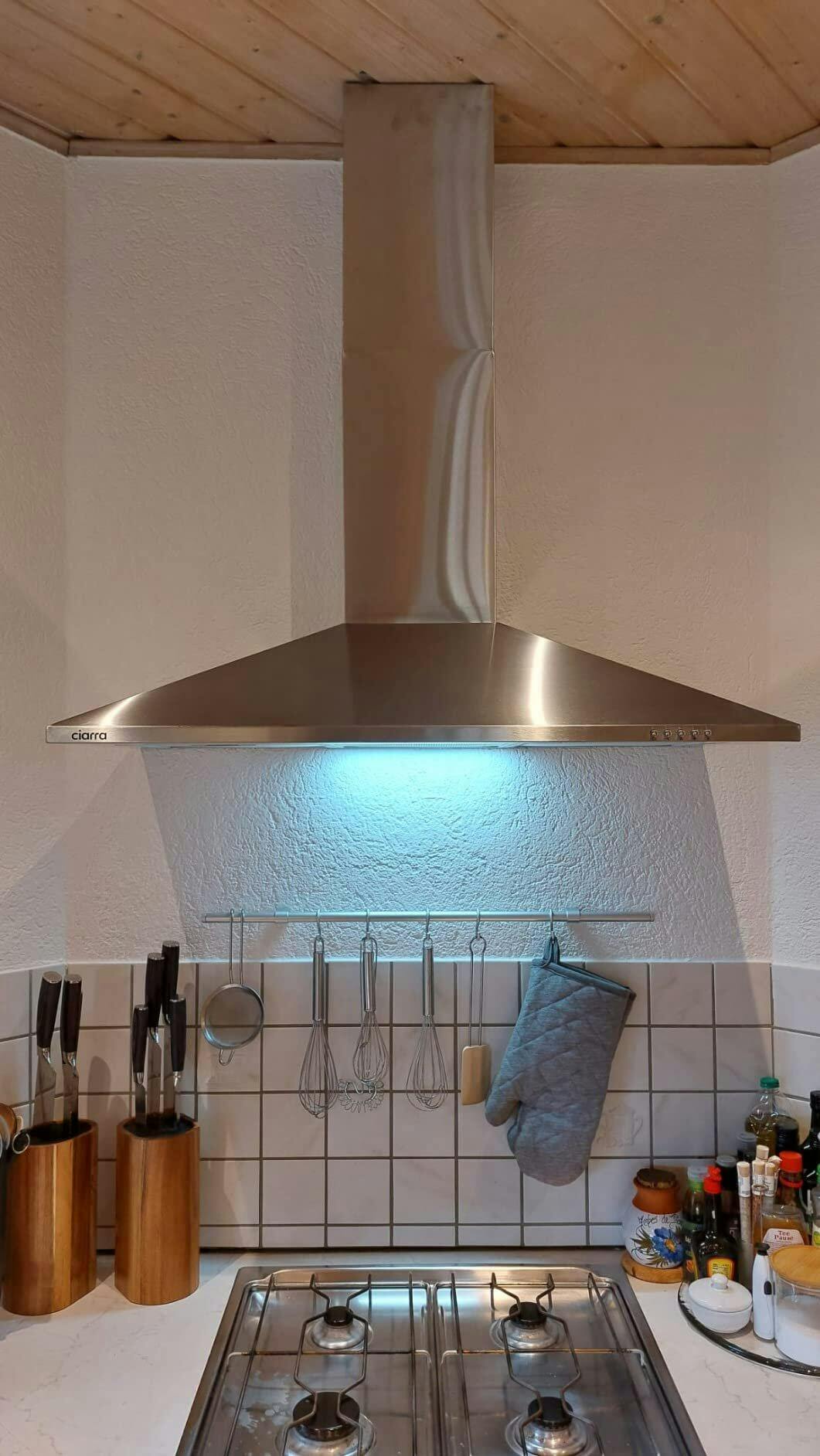 Belle hotte blanche, vraiment dommage qu'elle n'existe pas en largeur 80cm, il suffirait de changer les facades! Par contre, l'eclairage led est un peu faible même en 2eme position ...