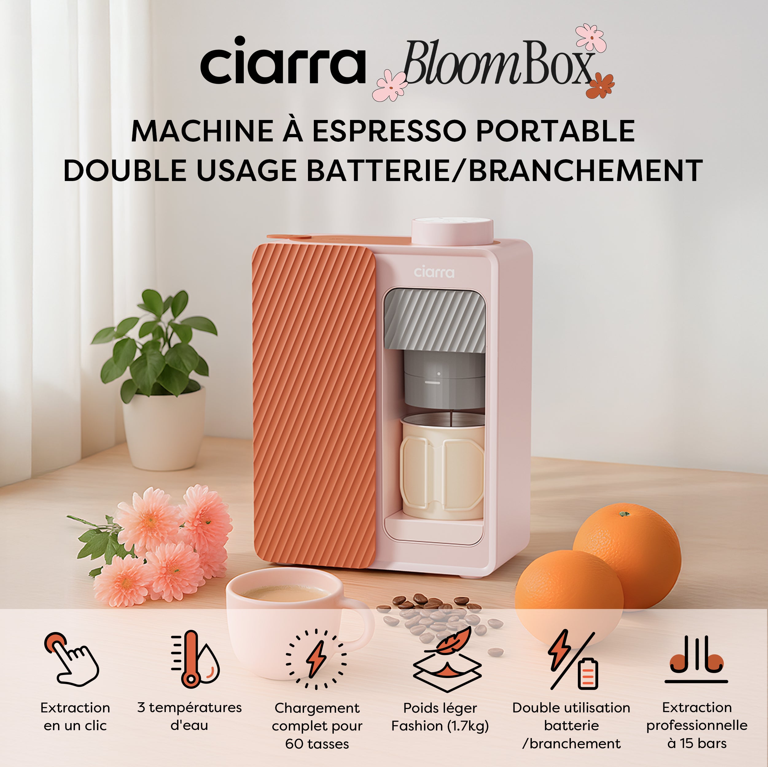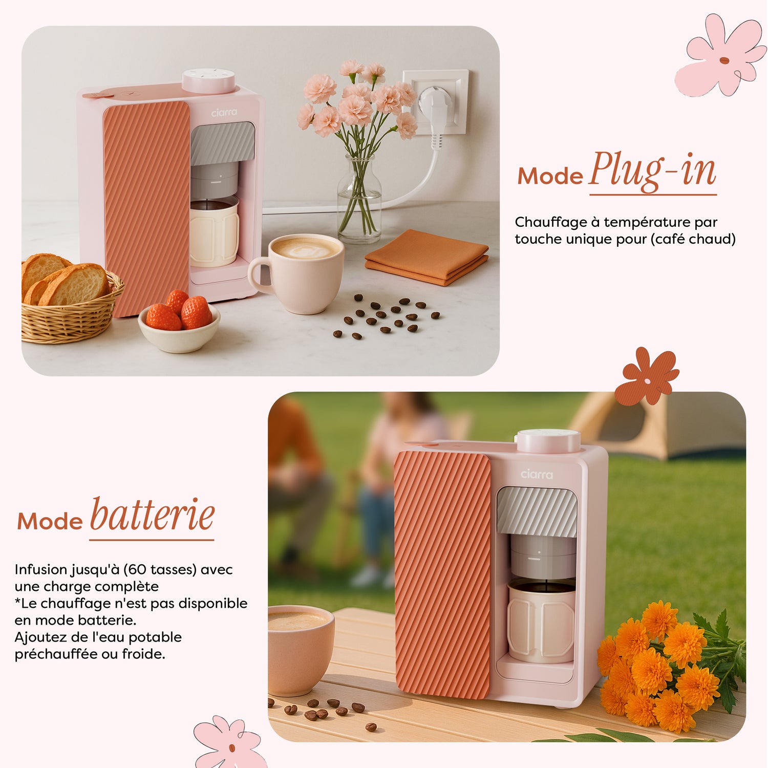 - 🔋 Utilisation 2-en-1 : Branchez-la à la maison ou au bureau, ou passez en mode portable pour préparer du café en extérieur. (❗️Lorsque la Ciarra BloomBox fonctionne sur batterie, elle ne chauffe pas l'eau froide. Vous pouvez utiliser de l'eau froide pour obtenir un café glacé, ou simplement verser de l'eau chaude au préalable pour déguster un expresso chaud classique.)