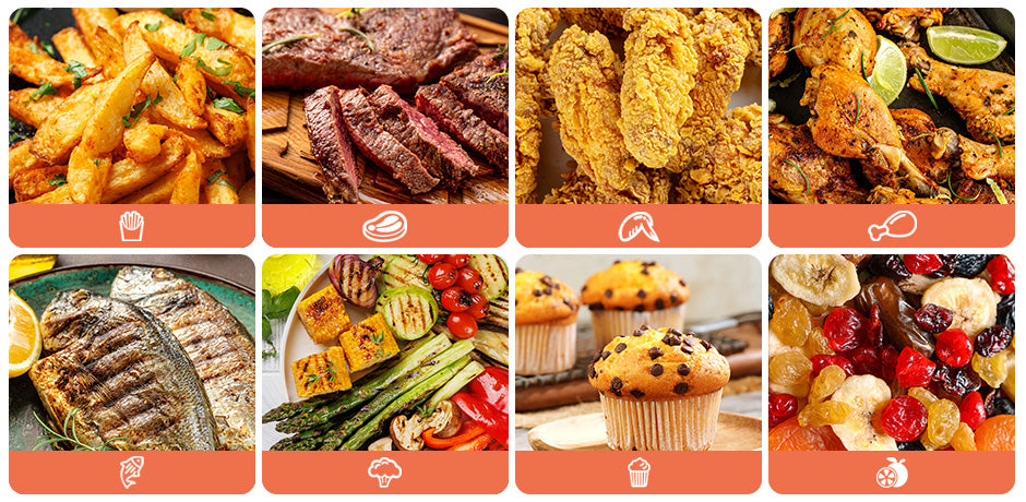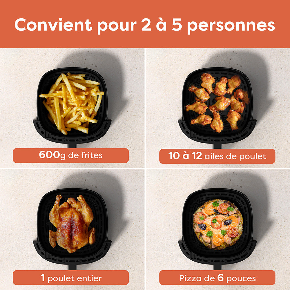 | Fonctions | 8 en 1 : Frites, Steak, Aile de poulet, Pilon, Poisson, Légumes, Gâteau, Fruits secs |
