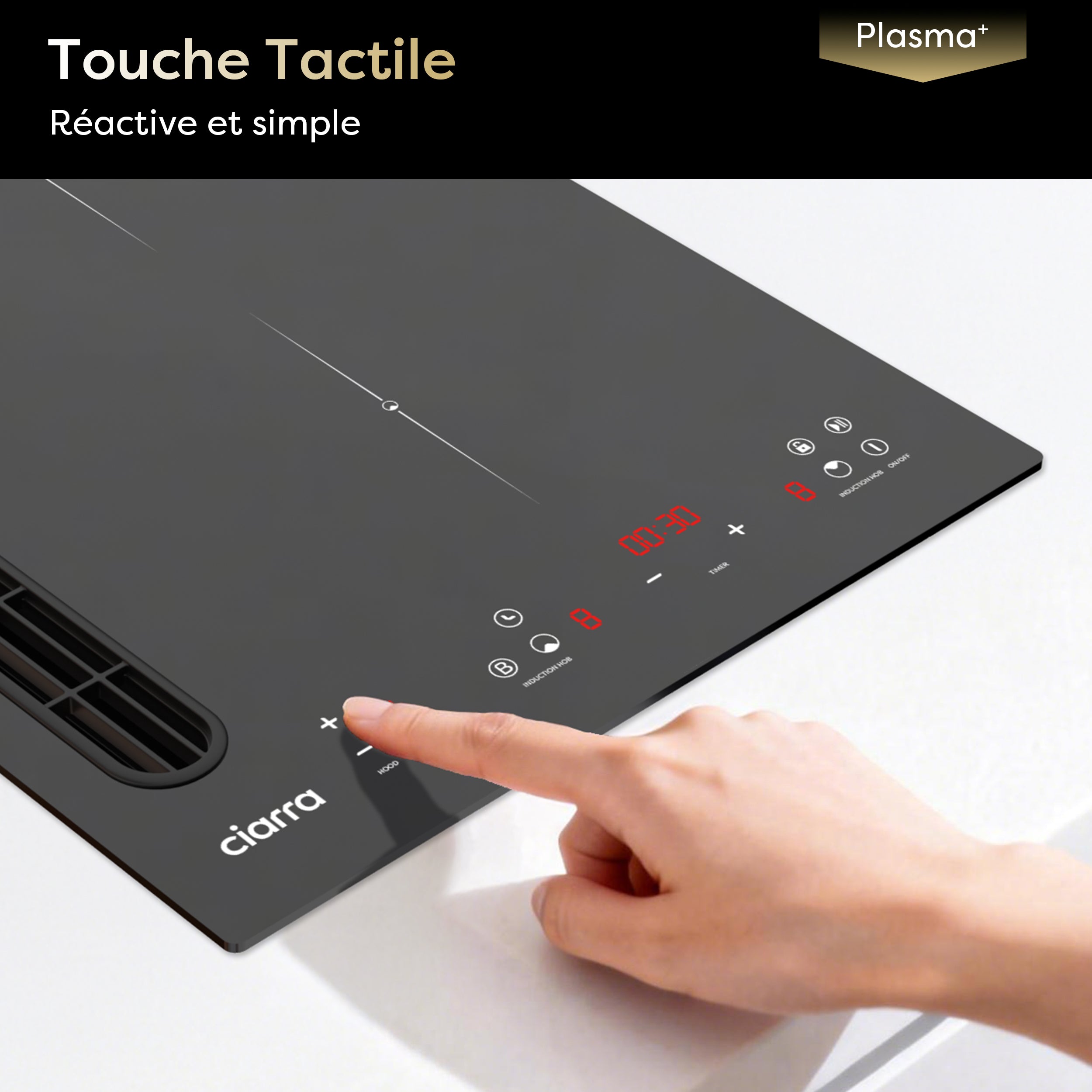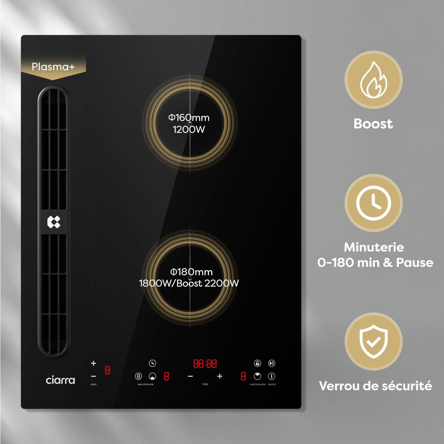 Ciarra ONE Plaque à Induction avec Hotte Intégrée Domino 390 mm avec Système Plasma⁺ Intégré et Boost CBBEH392B-OW
